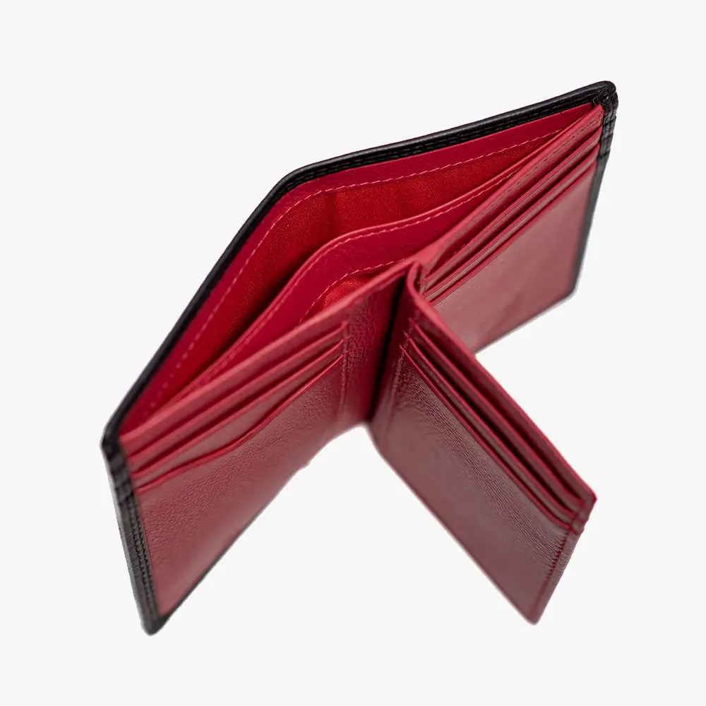 INTERIOR FUNCIONAL: Múltiples compartimentos para tarjetas y documentos con forro interior en color rojo distintivo