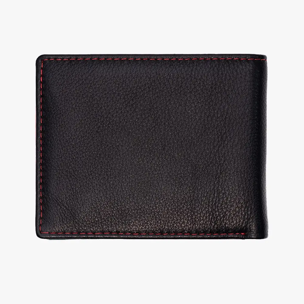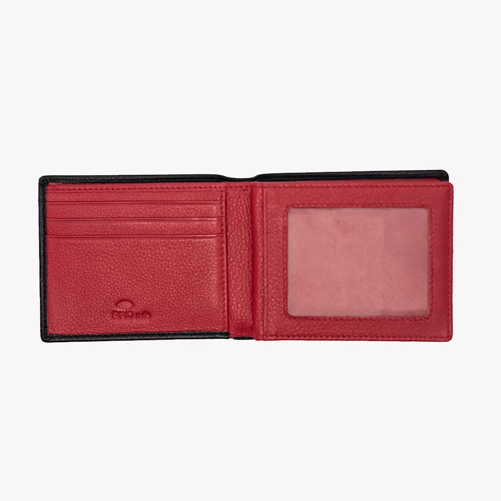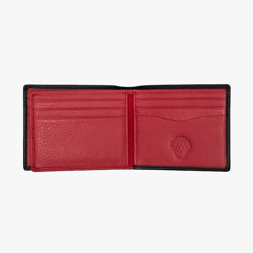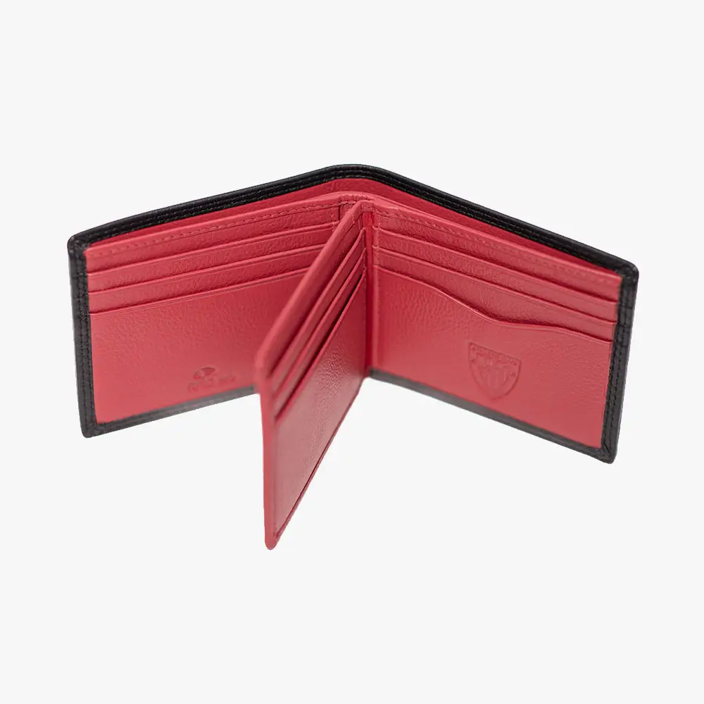 Descubre esta elegante cartera oficial del Athletic Club, fabricada en piel 100% vacuno de primera calidad. Diseñada con el distintivo León. El exterior en negro con costuras rojas decorativas refleja los colores tradicionales del equipo, mientras que el interior en rojo vibrante incluye múltiples compartimentos para tarjetas y documentos. Cuenta con tecnología RFID safe para proteger tus tarjetas bancarias contra lecturas no autorizadas.