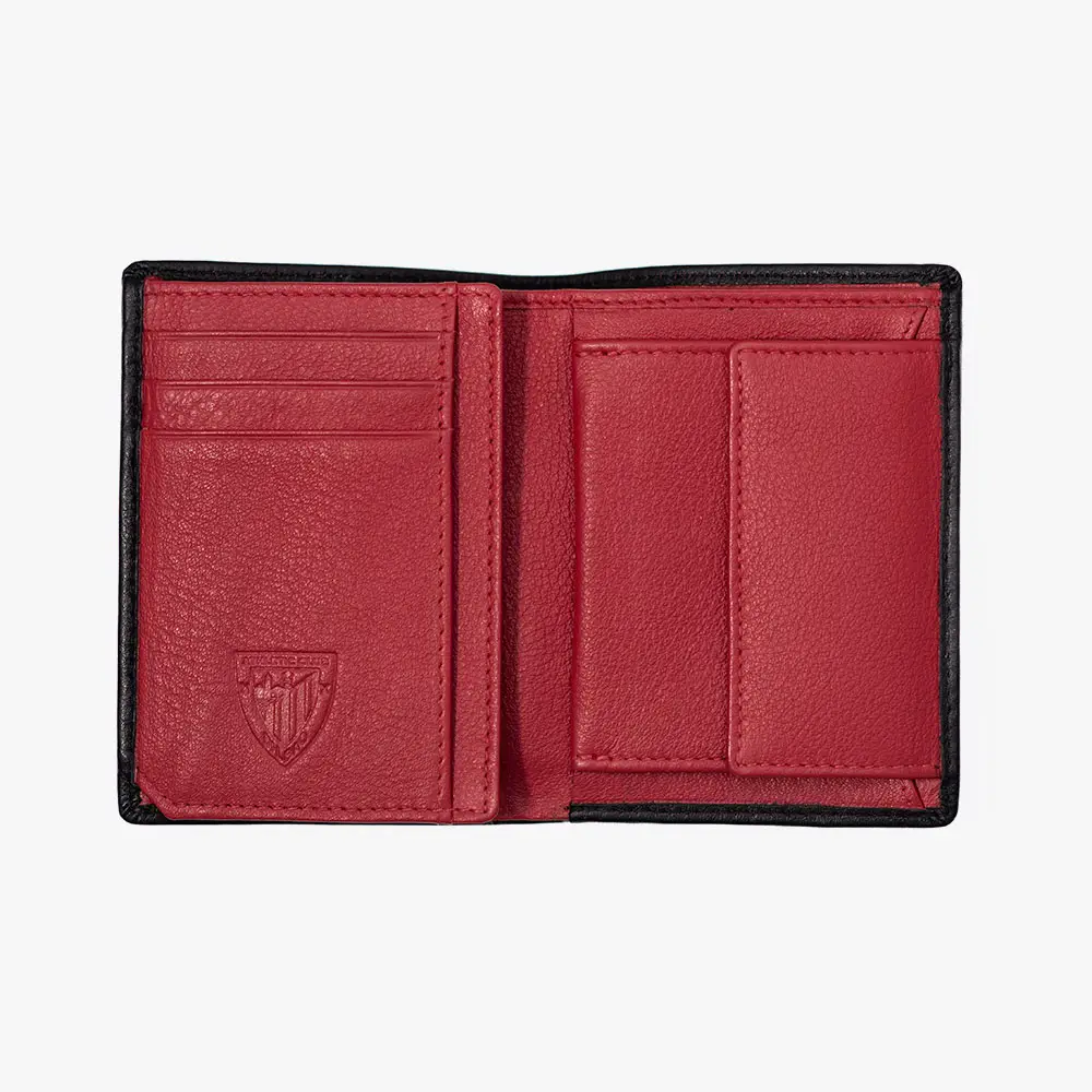 Descubre esta elegante cartera oficial del Athletic Club, fabricada en piel 100% vacuno de primera calidad. Diseñada con el distintivo Escudo. El exterior en negro con costuras rojas decorativas refleja los colores tradicionales del equipo, mientras que el interior en rojo vibrante incluye múltiples compartimentos para tarjetas y documentos. Cuenta con tecnología RFID safe para proteger tus tarjetas bancarias contra lecturas no autorizadas.