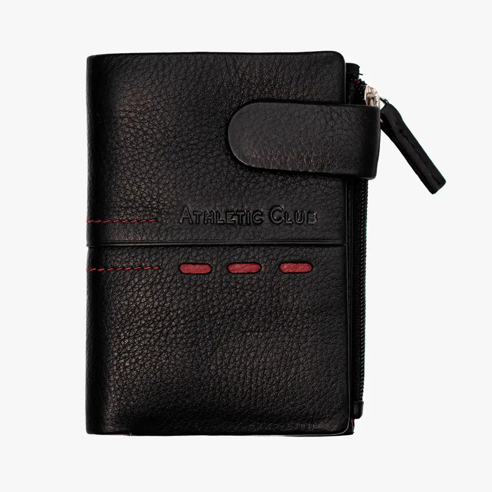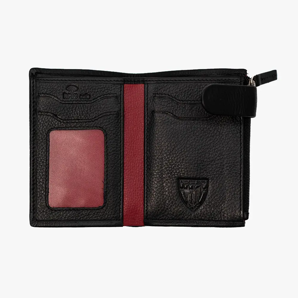 Descubre este elegante tarjetero monedero oficial del Athletic Club, fabricada en piel 100% vacuno de primera calidad. Diseñada con el nombre del club. El exterior en negro con costuras rojas decorativas refleja los colores tradicionales del equipo, mientras que el interior en rojo vibrante incluye múltiples compartimentos para tarjetas y documentos. Cuenta con tecnología RFID safe para proteger tus tarjetas bancarias contra lecturas no autorizadas.