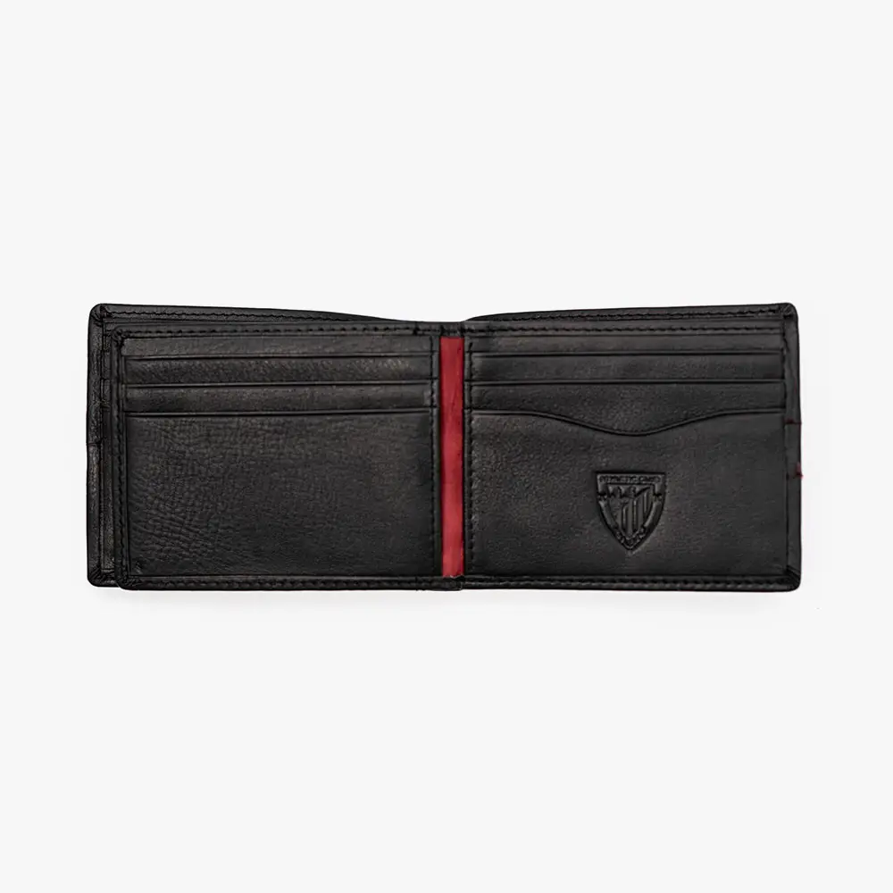 Descubre esta elegante cartera oficial del Athletic Club, fabricada en piel 100% vacuno de primera calidad. El exterior en negro con costuras rojas decorativas refleja los colores tradicionales del equipo, mientras que el interior incluye múltiples compartimentos para tarjetas y documentos. Cuenta con tecnología RFID safe para proteger tus tarjetas bancarias contra lecturas no autorizadas.