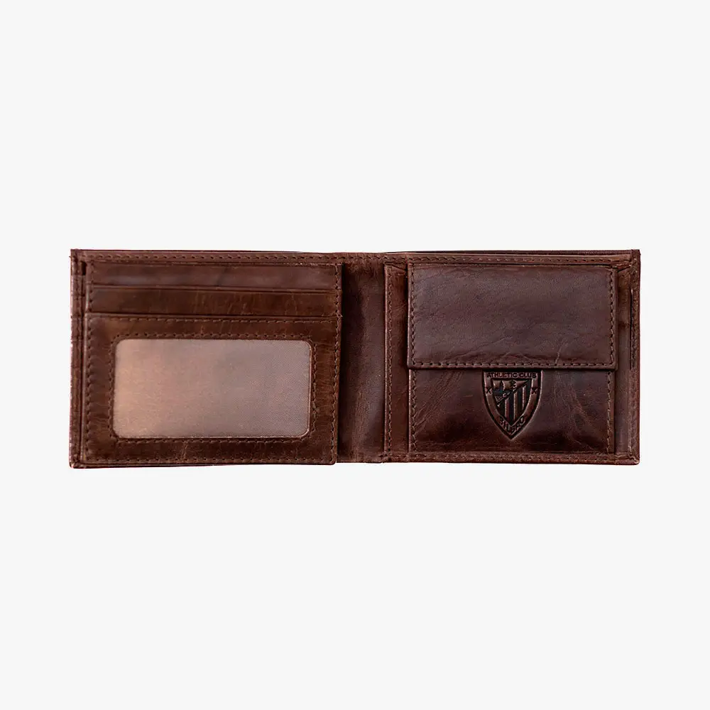 Esta elegante billetera de piel 100% vacuno del Athletic Club Bilbao combina estilo clásico con funcionalidad práctica. Fabricada en cuero genuino de alta calidad en color marrón, presenta el emblemático diseño AC en relieve en la parte frontal, mostrando tu pasión por el club. Con unas dimensiones compactas de 11x8cm, esta billetera oficial incluye múltiples compartimentos para tarjetas, espacios para billetes, un práctico bolsillo con ventana transparente para identificación o fotografías y un monedero interior con cierre de botón.