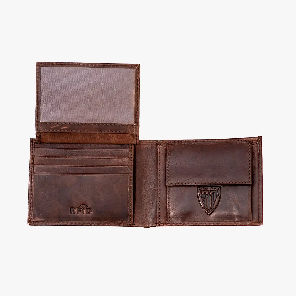 El diseño interior cuenta con protección RFID para mayor seguridad de tus tarjetas. Se entrega en una elegante caja negra con el escudo del Athletic Club, lo que la convierte en el regalo perfecto para cualquier aficionado rojiblanco.