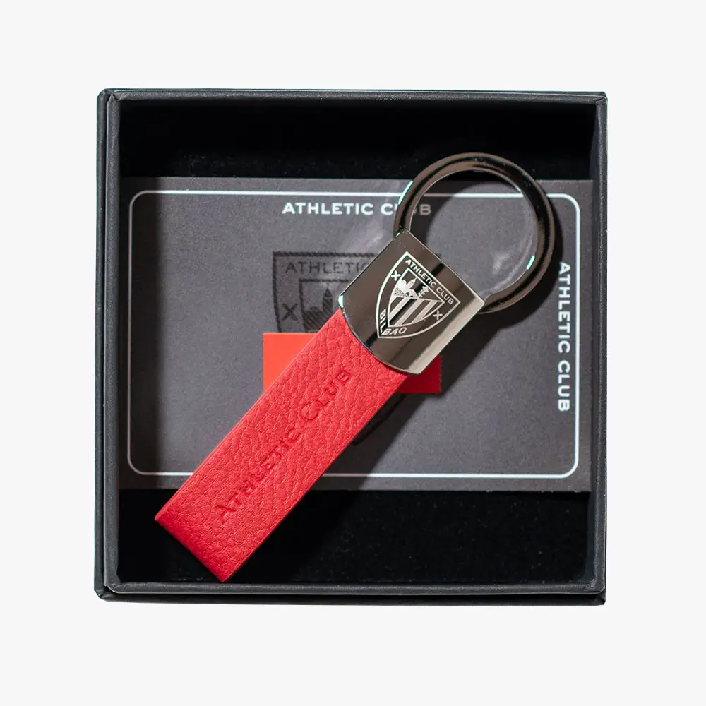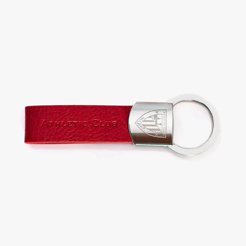 Llavero oficial Athletic Club. Fabricado en piel color rojo y acero. Dispone de una argolla para incorporar de manera sencilla varias llaves Parte de acero grabada con el escudo del club. Cuero de alta calidad color rojo grabado con las letras del club.