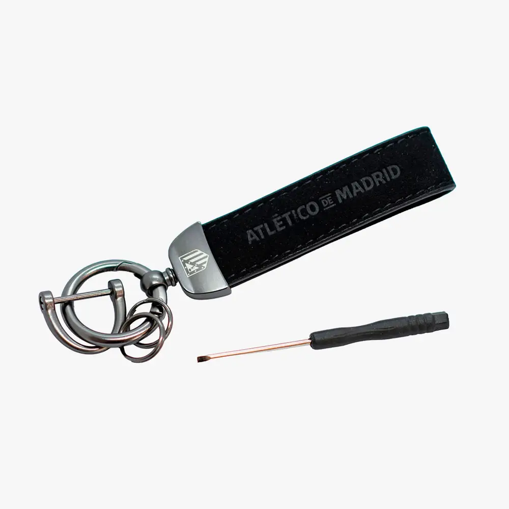 Llavero de ante negro, con letras grabadas y escudo serigrafiado. Producto Oficial Atlético de Madrid. Cuenta con una argolla grande y 2 pequeñas.