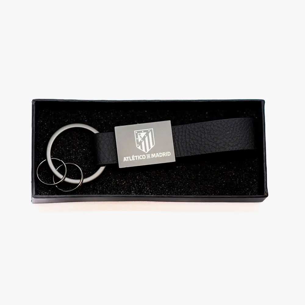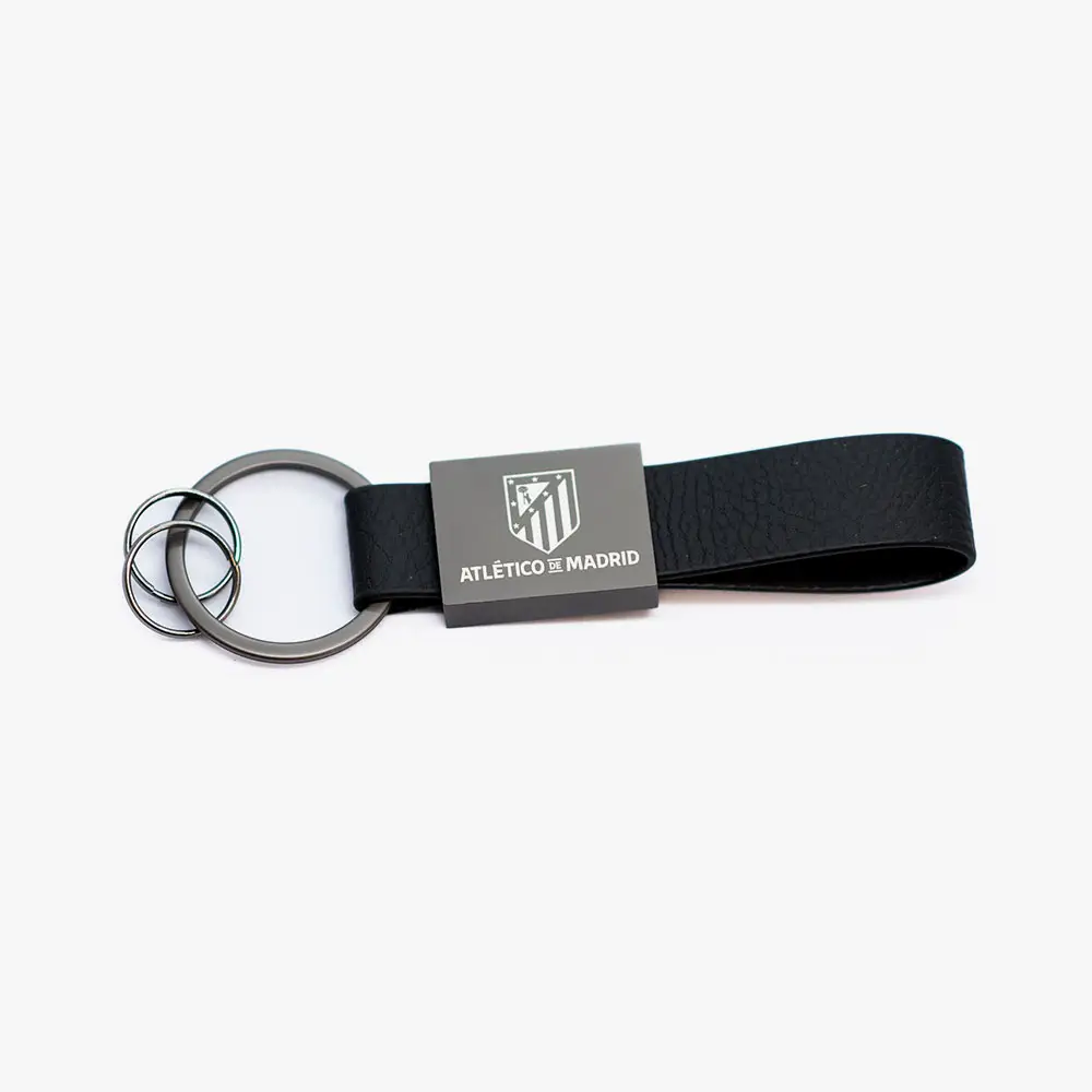 Llavero oficial Atlético de Madrid. Fabricado en piel color negro y acero. Dispone de una argolla para incorporar de manera sencilla varias llaves Parte de acero grabada con el escudo del club. Cuero de alta calidad color negro grabado con las letras del club.