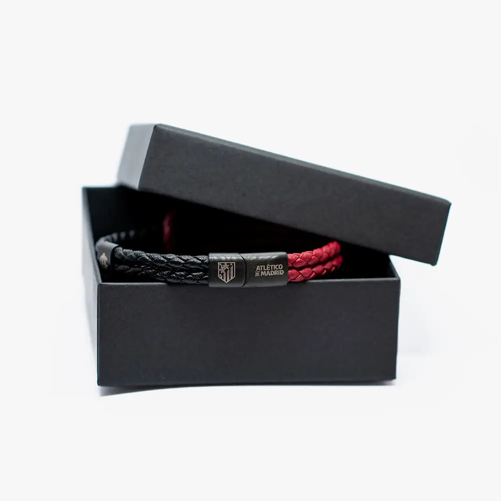 Esta elegante pulsera de piel trenzada roja y negra del Atlético de Madrid combina estilo náutico con pasión futbolística. Fabricada con piel trenzada de alta calidad, presenta un distintivo nudo marinero que aporta un toque sofisticado y deportivo a cualquier look. El cierre magnético de acero lacado en negro está grabado con el nombre y el emblemático escudo del Atlético de Madrid, garantizando un cierre seguro y fácil de usar.